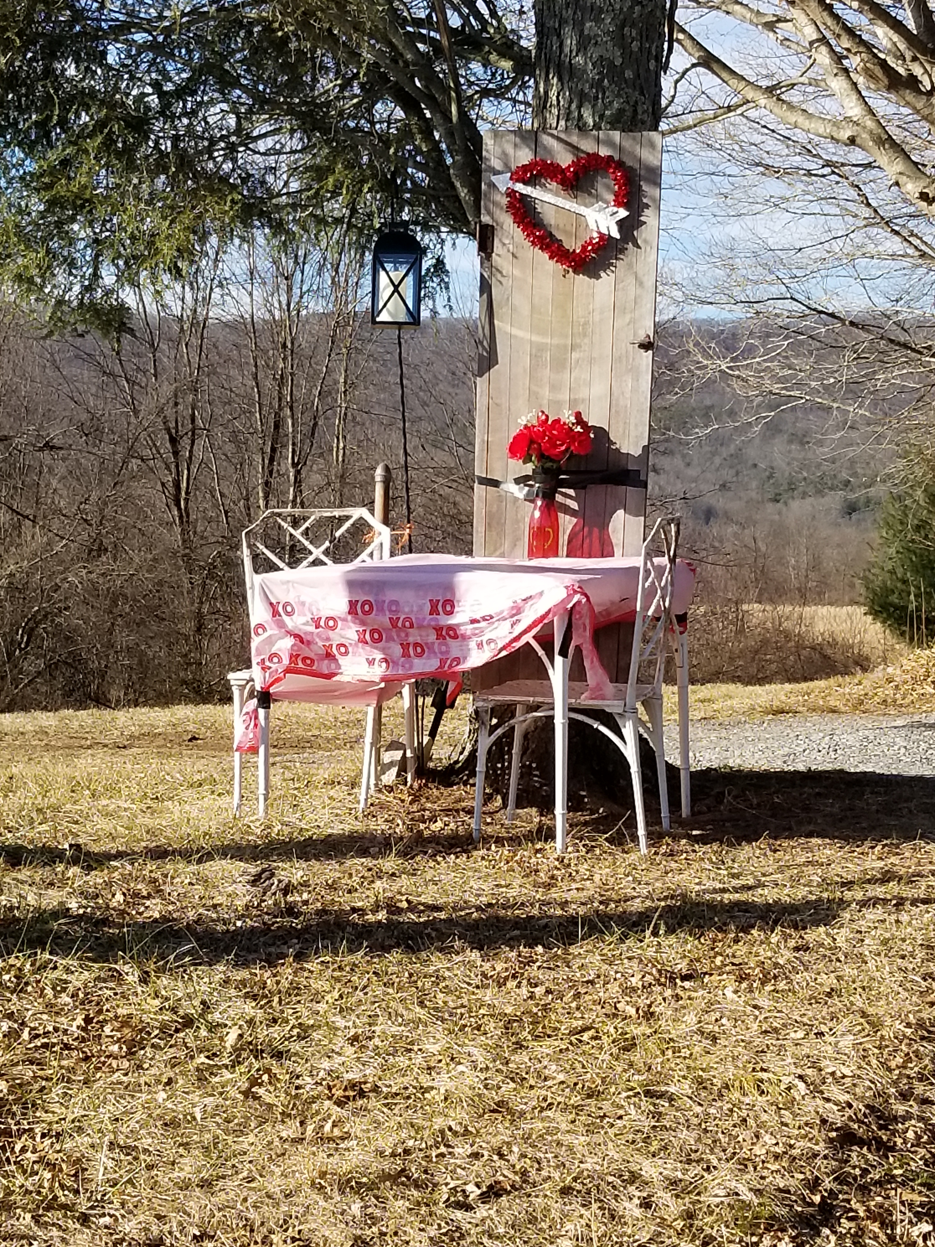 A white wrought iron table stands against the plank. Covered in a pink table cloth bordered in red -lettered XOXOXs, the table hosts a red vase with artificial red roses. All it needs now are two lovers, albeit dressed for Antartica, seated at the table, ready for. . . .who knows??