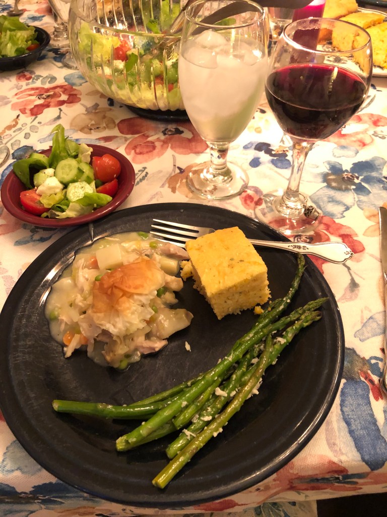 March Menu: Tossed Salad, Savory Cornbread, Chicken Pot Pie Casserole, Roasted Asparagus, Black Forest Cheesecake and WINE!